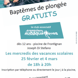 Organisé par le club de plongée Aresquiers Subaquatiques de Frontignan la Peyrade Baptêmes de plongée gratuits 🕛 Mercredi 4 mars … Lire la suite de « Baptêmes de plongée gratuits »