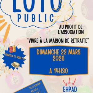 Organisé au profit de l’association Vivre à la maison de retraite. 📅 Dimanche 22 mars – 14h30 📍 EHPAD Anatole-France, … Lire la suite de « Loto »