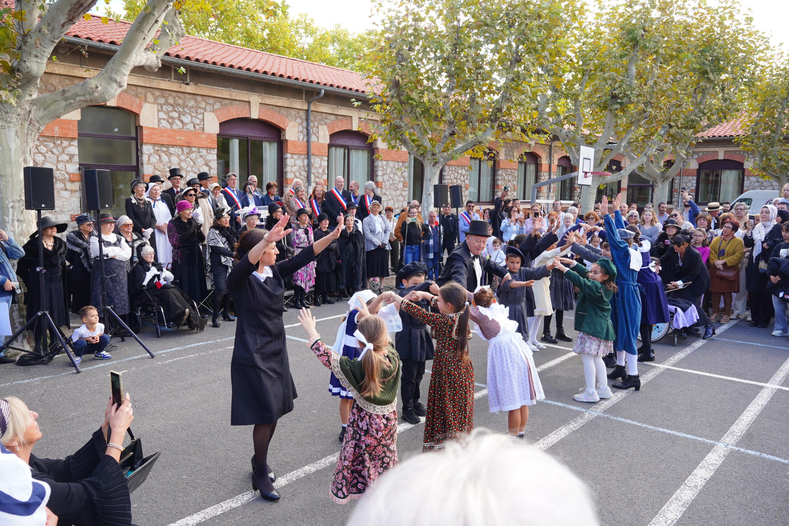 Le samedi 4 octobre a marqué l’apothéose de cette année de commémoration avec une matinée chargée d’animations et d’émotion, 100 ans jour pour jour après l’inauguration. Dès 10h, anciens élèves, enseignants, familles et habitants s’étaient donné rendez-vous devant l’Hôtel de Ville pour une déambulation costumée jusqu’à l’école, guidée par l’association Le Temps Jadis, tandis que le Club Taurin Lou Senglié distribuait des friandises en musique à bord d’une voiture ancienne. Jupes plissées, bérets et tabliers d’antan ont coloré les rues dans une ambiance joyeusement rétro, rappelant les rentrées du siècle dernier.