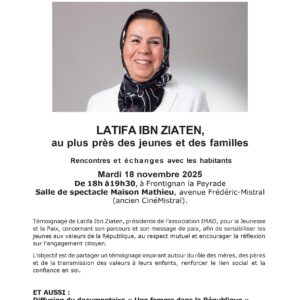 Mardi 18 novembre, de 18h à 19h30, Latifa Ibn Ziaten viendra à la rencontre des habitants de Frontignan la Peyrade. … Lire la suite de « Latifa Ibn Ziaten, au plus près des jeunes et des familles »