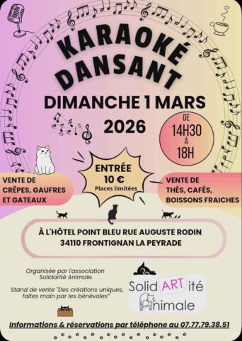 Karaoké dansantEnvoyer par mail Partager Facebook TwitterContraste Zoom Imprimer Imprimer Le 1 mars 2026 de 14h30 à 18h00 CatégoriesSortieLieu : Hôtel Point BleuRue Auguste Rodin34110 Frontignan la PeyradePublic : tout publicTarif : 10 €Contact : Solid-ART-ité AnimaleKaraoké dansant organisé par Solid-ART-ité Animale.📅 Dimanche 1er mars – De 14h30 à 18h📍 Hôtel Point Bleuℹ️ Vente de crêpes, gaufres et gâteaux – Informations et réservations : 07 77 79 38 51
