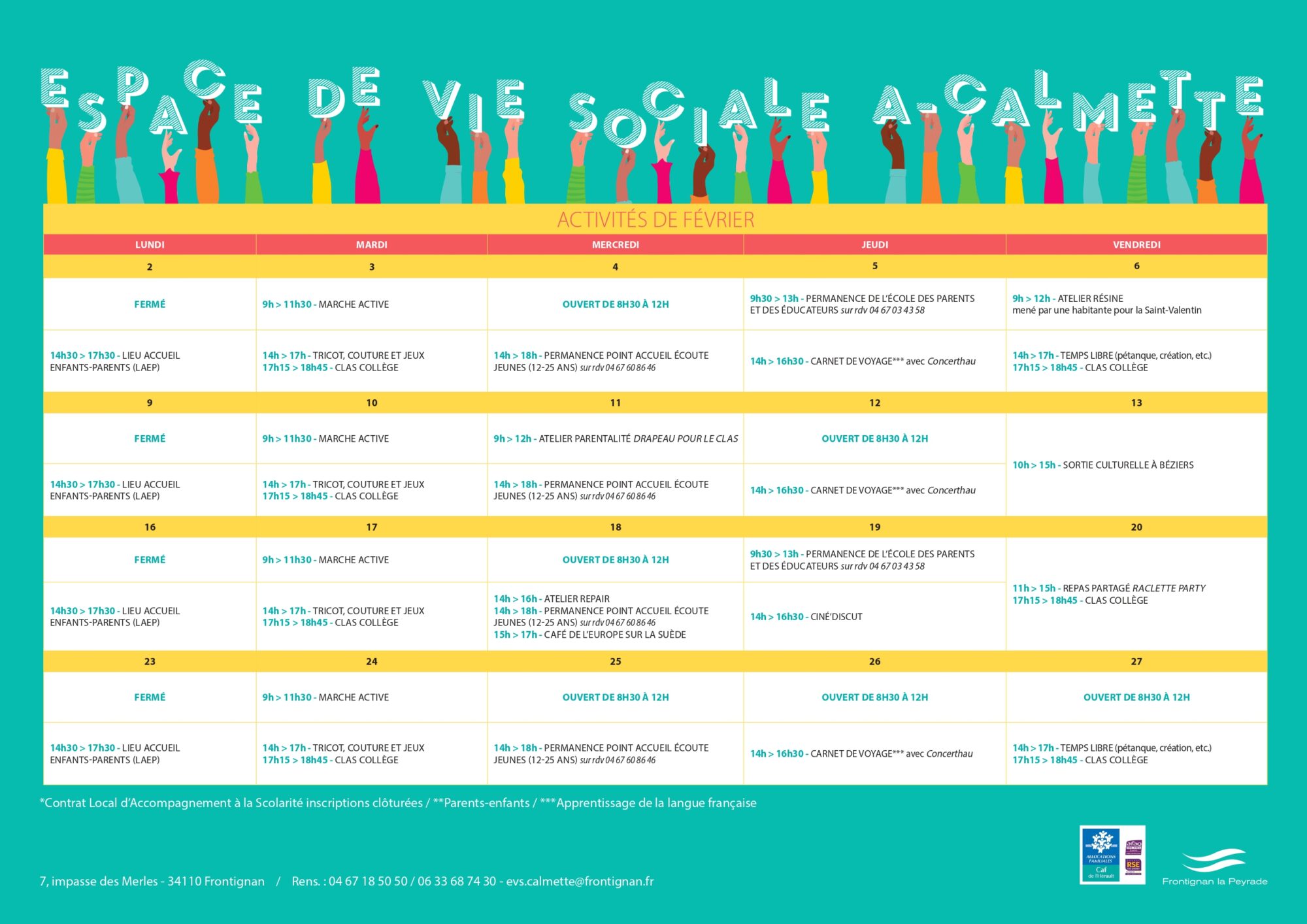 La Ville de Frontignan la Peyrade et ses associations proposent aux familles de nombreuses activités, pour la plupart gratuites, au sein de sa structure impasse des Merles ou dans Frontignan. Sport, ateliers couture, tricot, jeux de société en famille, sorties au cinéma ou à la médiathèque, rencontres, échanges et débats, visites, permanences d’accompagnement, etc.