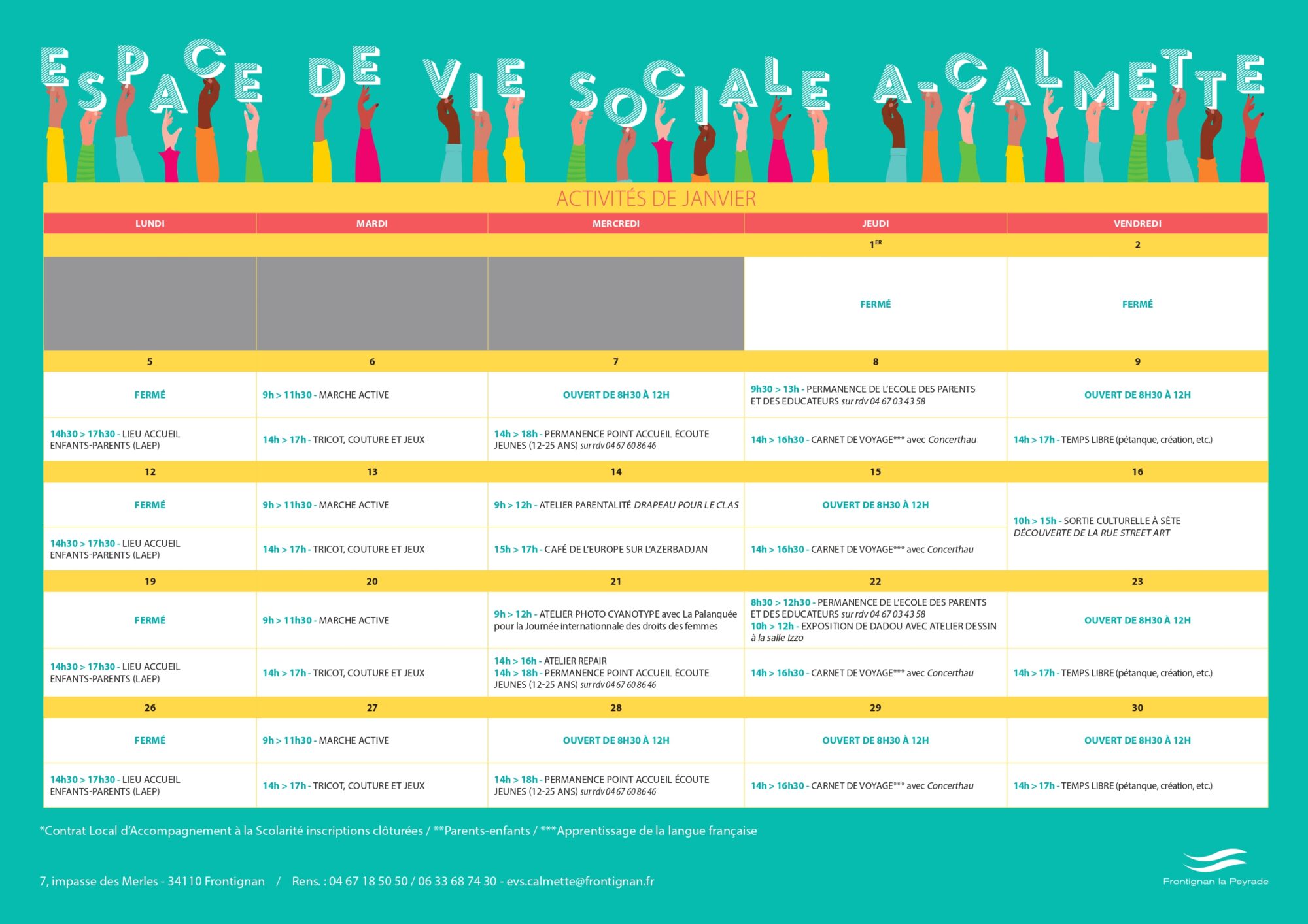 La Ville de Frontignan la Peyrade et ses associations proposent aux familles de nombreuses activités, pour la plupart gratuites, au sein de sa structure impasse des Merles ou dans Frontignan. Sport, ateliers couture, tricot, jeux de société en famille, sorties au cinéma ou à la médiathèque, rencontres, échanges et débats, visites, permanences d’accompagnement, etc.