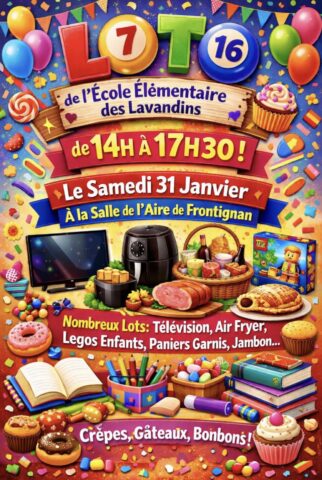 Loto de l’école élémentaire Les LavandinsEnvoyer par mail Partager Facebook TwitterContraste Zoom Imprimer Imprimer Le 31 janvier 2026 à 14h00 CatégoriesJeuxLieu : Salle de l'Aire34110 Frontignan la PeyradePublic : tout publicContact : École élémentaire Les Lavandins🕛 Samedi 31 janvier 2026 – 14h 📍 Salle de l’Aire