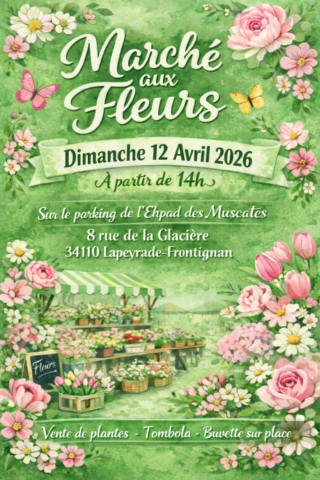 Marché aux fleursEnvoyer par mail Partager Facebook TwitterContraste Zoom Imprimer Imprimer Le 12 avril 2026 à 14h00 CatégoriesEconomie/CommerceLieu : Parking de l’Ehpad des Muscates,8, rue de la Glacièrequartier de La Peyrade34110 Frontignan la PeyradePublic : tout publicContact : Vivre à la maison de retraiteOrganisé au profit de l’association Vivre à la maison de retraite. Vente de plantes. Tombola. Buvette sur place.📅 Dimanche 12 avril – Dès 14h📍 Parking de l’Ehpad des Muscates
