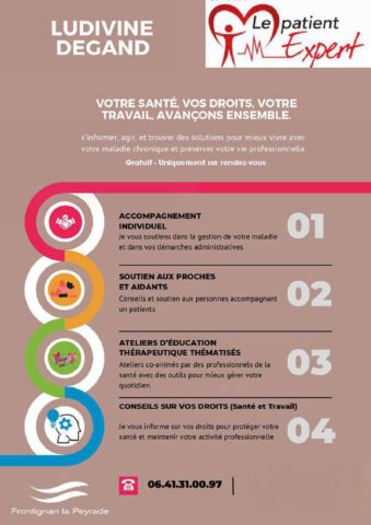 En partenariat avec la ville de Frontignan la Peyrade, Ludivine Degand, patiente experte, vous accueille et vous informe afin de vous aider à trouver des solutions pour mieux vivre avec la maladie chronique et préserver la vie professionnelle.