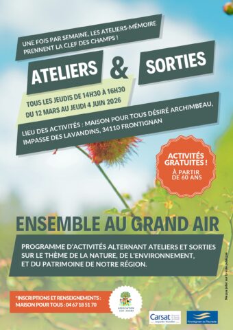 Dans ce cadre, en partenariat avec la Ville, Le projet « Ensemble au grand air » voit le jour, pour proposer des ateliers mémoires sous forme de sorties, tous les jeudis de 14h30 à 16h30, du 12 mars au jeudi 4 juin 2026. Activités gratuites sur le thème de la nature, de l’environnement et du patrimoine de notre région, à partir de 60 ans.