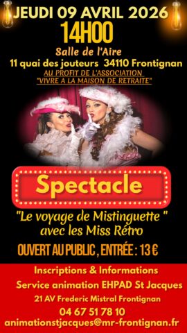 ℹ️ Tarif : 13€. Ouvert à tous – Rens. et insc. : Service animation EHPAD Saint-Jacques, 21, av. Frédéric-Mistral 04 67 51 78 10 – animationstjacques@mr-frontignan.fr