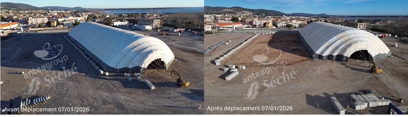 Après avoir été déplacée pour la 16e fois le 28 octobre dernier, l’immense tente gonflable de 120 m de long par 50 m de large et 16 m de haut – un dispositif unique au monde destiné à limiter les émanations d’odeurs d’hydrocarbures et la diffusion des poussières – a changé de position pour la dernière fois mercredi 7 janvier 2026. Les excavations seront terminées début mars 2026. S’ensuivront trois mois consacrés au démontage du dôme gonflable et de la tente conventionnelle utilisée pour le criblage et le stockage des terres, au démantèlement de l’unité de traitement des eaux et de la base-vie, au nivellement final du sol et au repli des engins de chantier. 170 000 m3 de terre auront ainsi été excavés sur 1 à 4 m de profondeur dont 85 000 m3 évacués hors site.