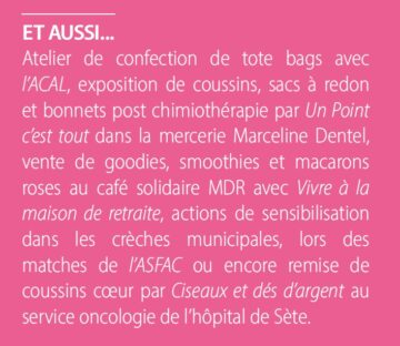 Sur le marché du coeur de ville, vente des créations confectionnées par l’EVS Albert-Calmette et Planète Parents (dont des coussins coeur et turbans) au profit du Montpellier Institut du Sein (MIS), également présent deux jeudis pour sensibiliser à l’autopalpation (2 et 30 octobre).